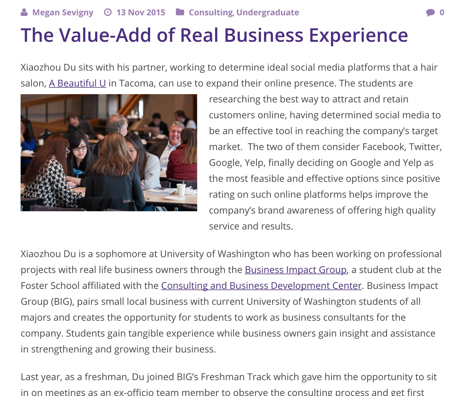 Xiaozhou Du is a graduate student at the University of Washington, currently seeking opportunities in marketing and consulting, given his passion and interest in technology industry. He is a proactive and self-motivated learner with the professional writing skill. He also possesses solid quantitative and qualitative research analytical skills, given such background of Communications, digital media and business consulting. He strengthens his skills and knowledge through work experiences. He is now a data and result oriented digital marketing and consulting professional. He aspires to be an international business professional with ample cultural and educational background.